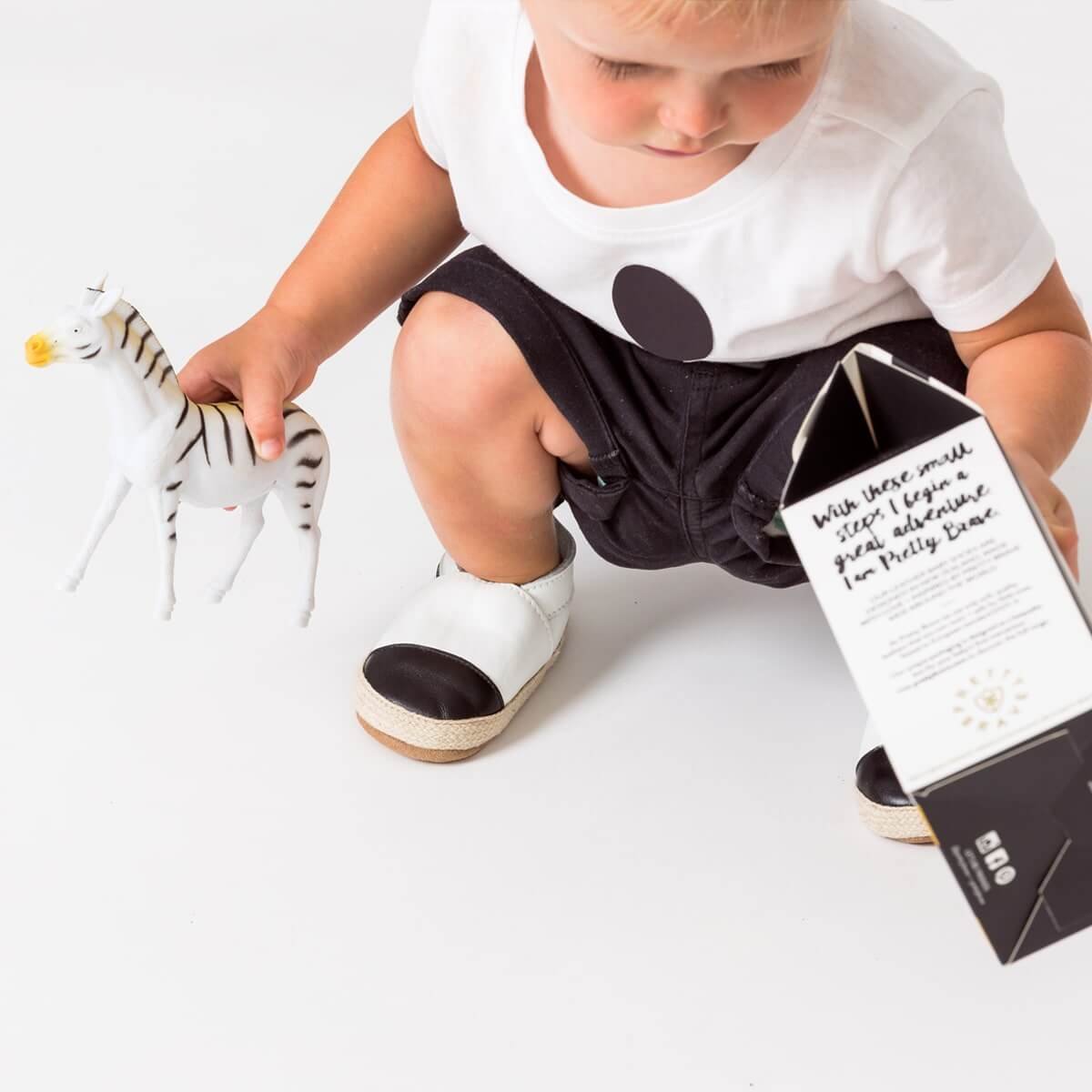 Great for playdates and out with mummy. These monochrome cool white espadrilles feature a contrast black toe cap and an elasticated ankle for easy slip on and no falling off feet! These are made from the softest of leather, making them suitable for the delicate skin of babies and toddlers.
